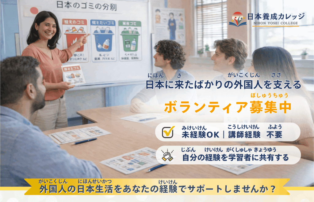 この教室は、外国人の方が日本で安心して生活できるよう支援を行っている「日本養成カレッジ」が運営しています。
