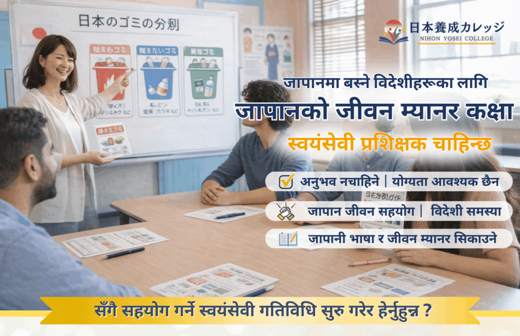 यो कक्षा जापानमा विदेशीहरूले सुरक्षित र安心सँग जीवन बिताउन सकून् भन्ने उद्देश्यले सहयोग गर्ने 「जापान योसेई कलेज」 द्वारा सञ्चालन गरिएको हो।
