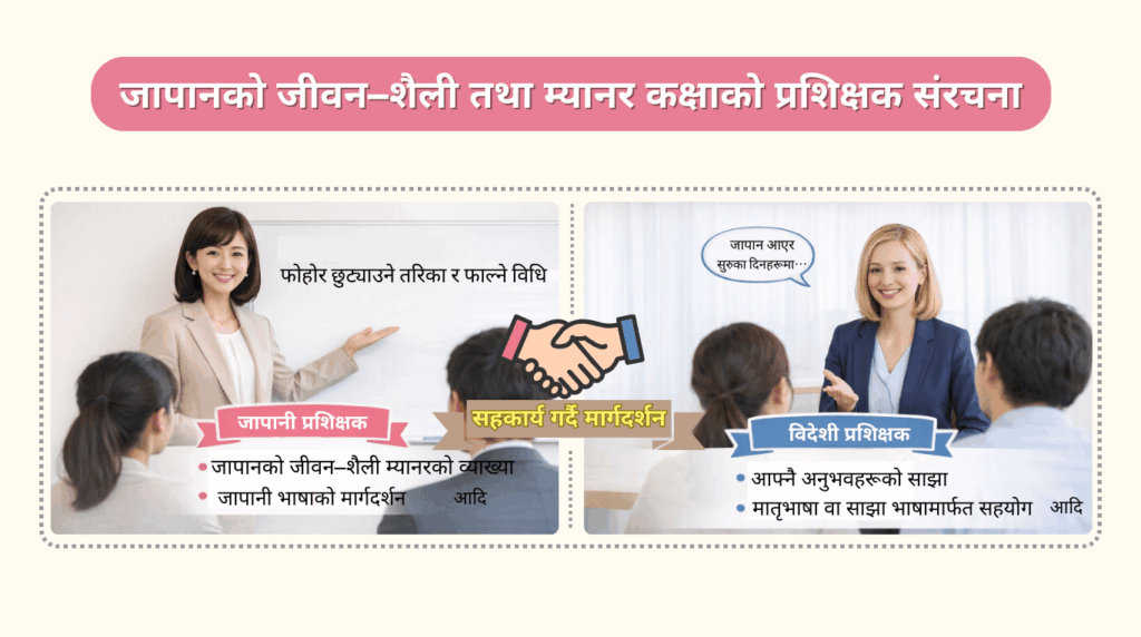 जापानी प्रशिक्षक र विदेशी प्रशिक्षकबीच सहकार्य र परामर्श गर्दै कक्षा सञ्चालन गरिन्छ।
