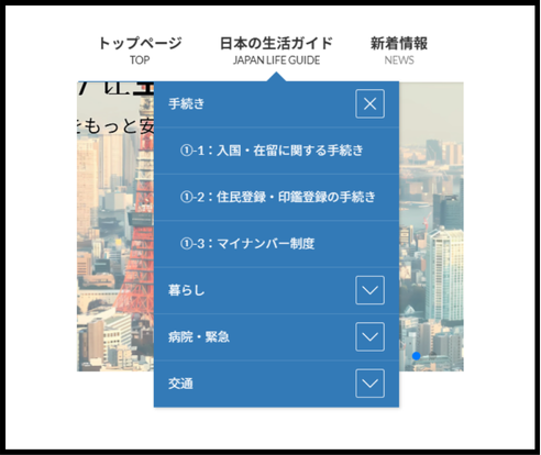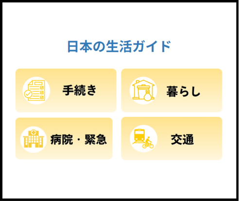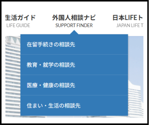 ページ上部のメニューやTOPページのボタンから、「在留手続き」「教育・就学」「医療・健康」「住まい・生活」のカテゴリーを選んでください。