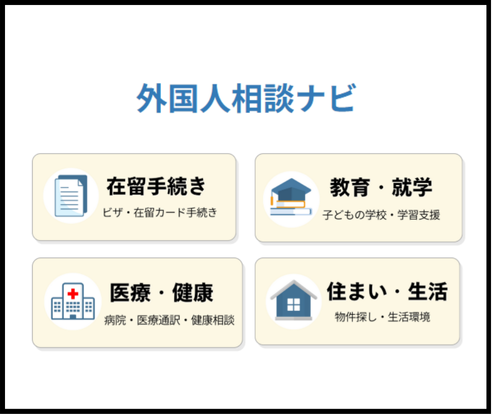 在留手続き、教育・就学、医療・健康、住まい・生活など、状況に合わせて利用できる公的機関や支援団体を案内します。